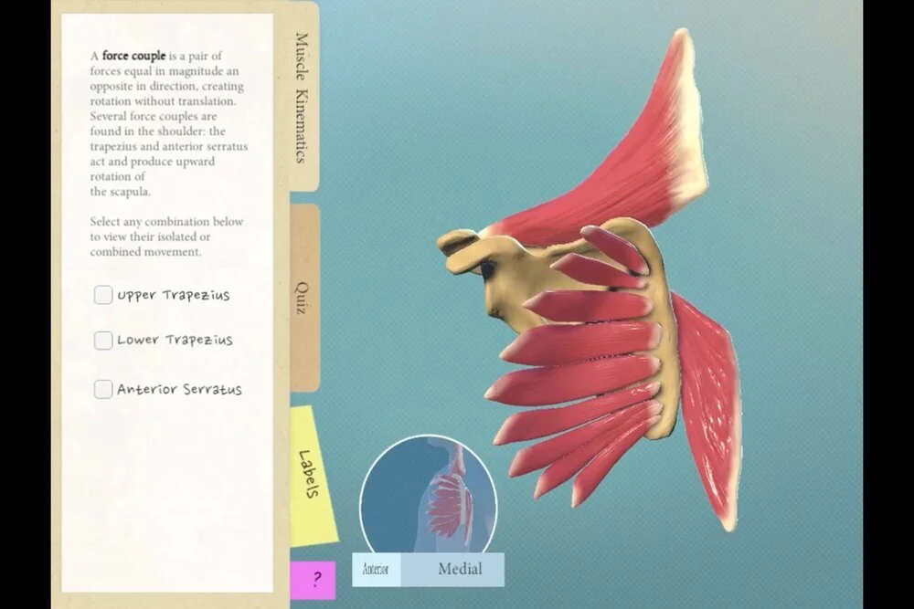The Scapula force couple is a game developed to introduce Physical Therapy students to the mechanics underlying shoulder rotation. The game focuses on three of the major muscles involved in rotation.